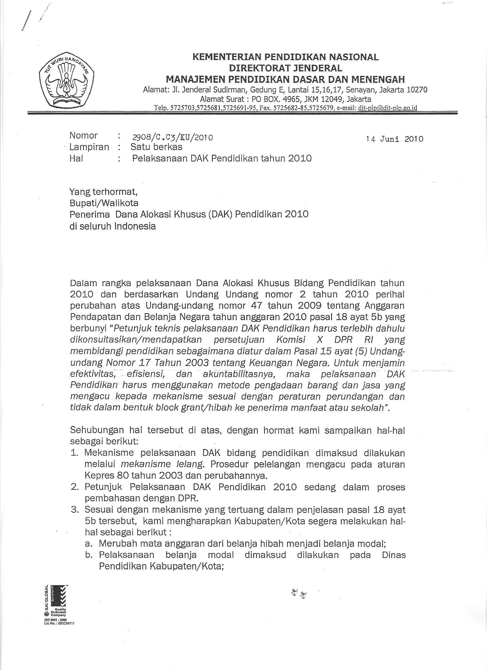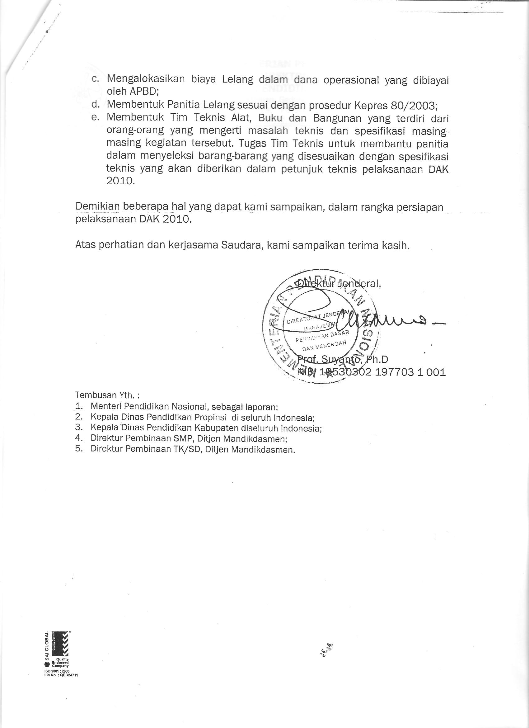 - Dasar hukum ketujuh adalah Surat Edaran (SE) Direktur Jenderal Manajemen Pendidikan Dasar dan Menengah (Mandikdasmen) No. 698/C/KU/2010 perihal Tata Cara Pelaksanaan Dana Alokasi Khusus (DAK) Bidang Pendidikan Tahun Anggaran 2010.